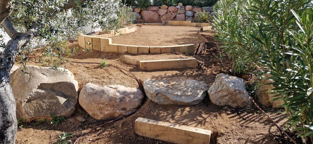 Une fois les traverses fixées, le tuff restant au milieu du terrain sera réparti uniformément sur toute la surface, nivelé et compacté à la plaque vibrante.