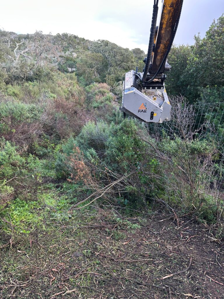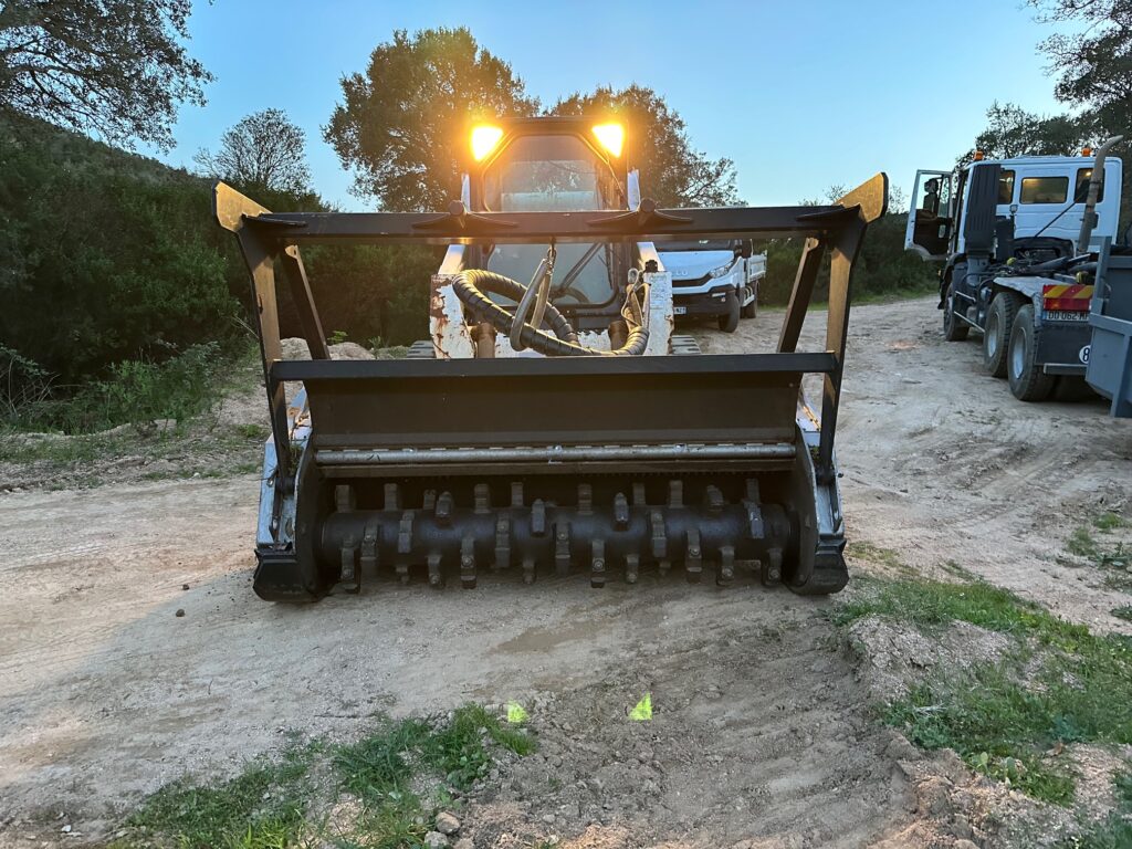 Démaquisage exécuté avec un bobcat équipé d’un broyeur forestier FAE et une pelle mécanique équipée d’un broyeur FAE.