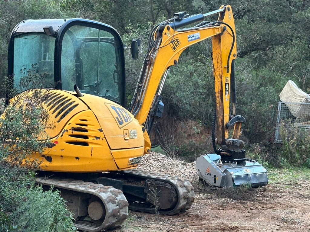 – pelle jcb 8055 ( puissance 34,1 kw, débit hydraulique 90 L/ minute) couplé avec un broyeur forestier FAE pml vitesse de rotation 2000 tours minutes et diamètre de broyage de 8 cm.