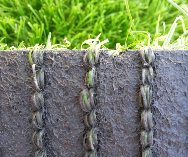 Une fois les fibres fixées à la trame en polypropylène tissée et stabilisée aux UV, elles sont emprisonnées par une enduction de latex de synthèse (styrène butadiène).