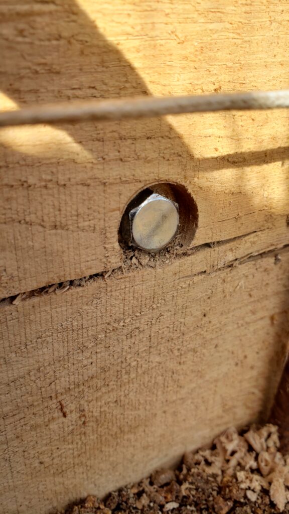 Mise à niveau des traverses en chêne et fixation entre elles à chaque angle grâce à des tirefond en acier galvanisé.