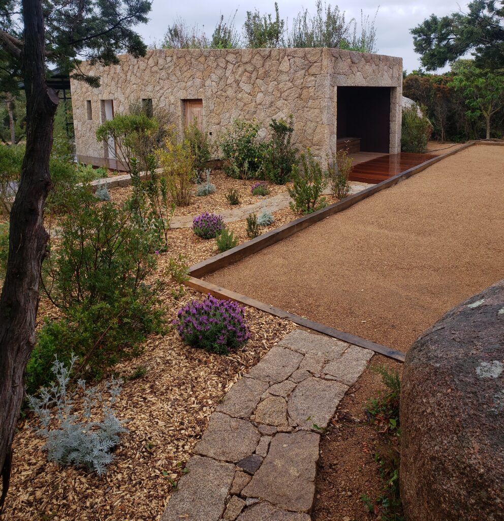 Une fois les traverses fixées, le tuff restant au milieu du terrain sera réparti uniformément sur toute le surface, nivelé et compacté à la plaque vibrante.